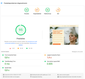 Je kan testen hoe snel jouw website is met de PageSpeed Insights tool van Google. Je geeft een url in en je krijgt een score. Deze score geldt enkel voor die ene pagina, je kan dus elke pagina van jouw website afzonderlijk gaan testen.